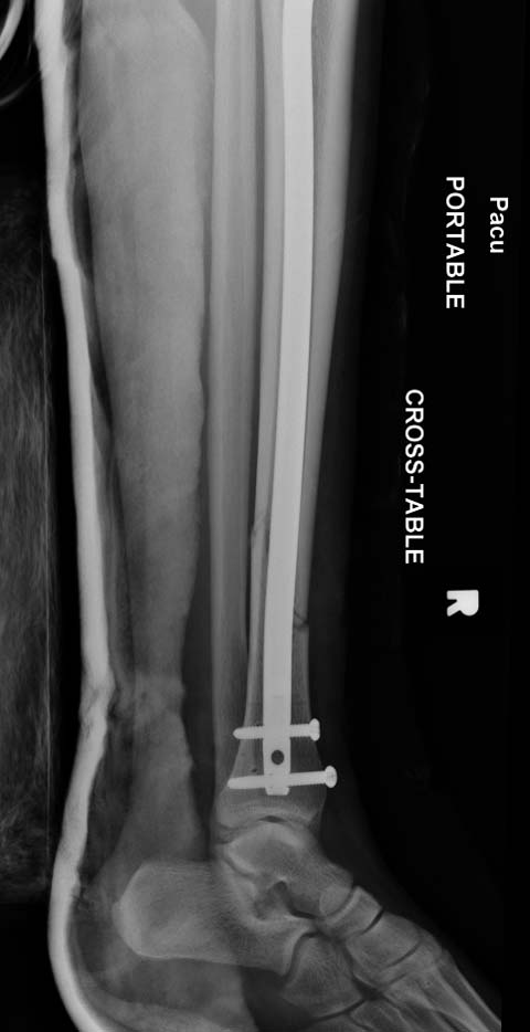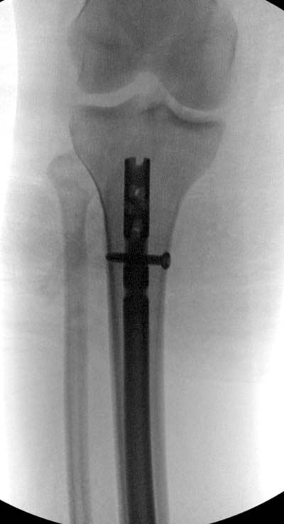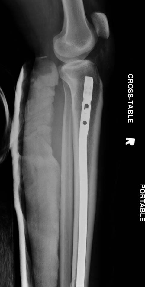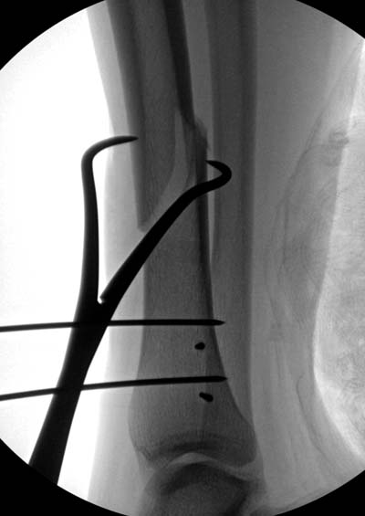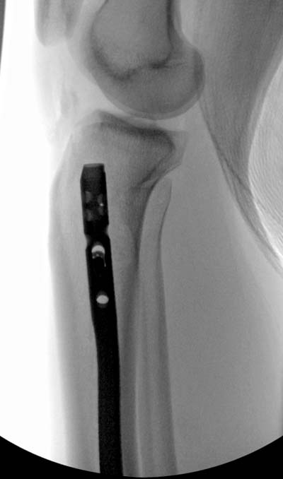 Здесь несколько снимков изолированного перелома большеберцовой с интактной малоберцовой. Weber clamp, блокирующие спицы и риминг в центре канала отрепонировал перелом....
