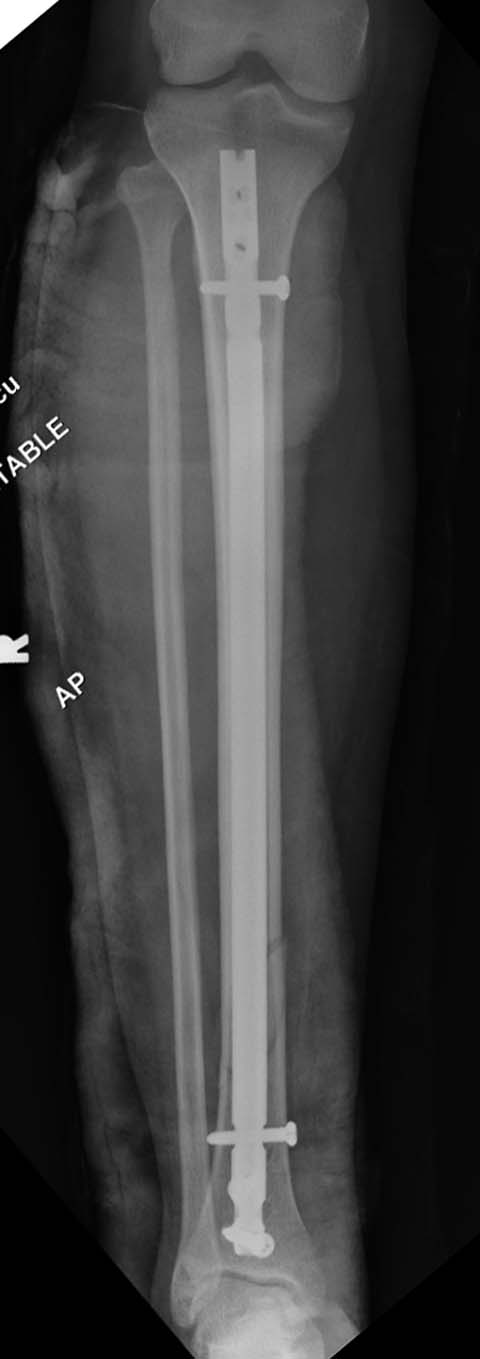 Разбор любого случая кому-то поможет лучше ориентироваться в решении вопросов, потому что в нашей работе встречаются разные связанные и несвязанные с мастерством хирурга ситуации. Возможно, отсутствие полного набора гвоздей повлияло на выбор короткого имплантата, имеется угловая и ротационная деформации. Независимо от локализации, стабильность создается, когда гвоздь проксимально не глубже 1.5 см (облегчает удаление) и дистально доходит до epiphyseal scar.
