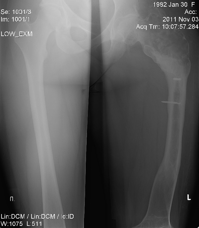07.03.01г. произошел закрытый подвертельный перелом левого бедра. 20.03.01г. (1) остеосинтез левого бедра пластиной АО. 31.03.03г.(4) Выполнена операция. Резекция ложного сустава в пределах жизнеспособных тканей, костная аутопластика из гребня правой повздошной кости, кортикотомия с 09.09.01г. (2) в связи с нестабильностью остеосинтеза выполнена повторная операция: удаление пластины АО, и остеосинтез пластиной DCS. Больная ходила при помощи костылей. 27.03.02г. (3) операция по поводу нестабильности остеосинтеза, ложный сустав левого бедра: некрсеквестрэктомия,костная аутопластика из гребня левой повздошной кости,остеосинтез Г-образной пластиной.28.11.02г. Выставлен диагноз: рефрактура проксимального отдела левого бедра в условиях остеосинтеза Г-образной пластины. Перелом пластины. Выраженный остеопороз. Укорочение левой нижней конечности на 5 см.