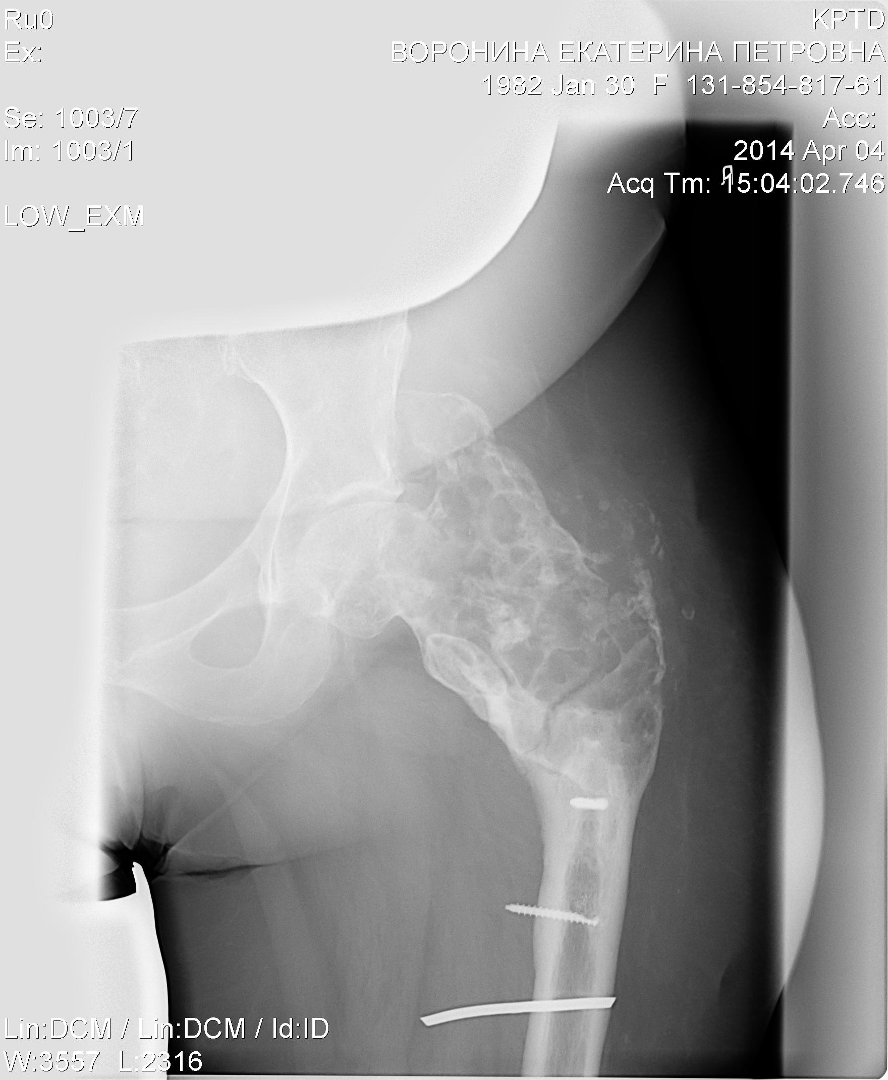 насколько я понял бедро не беспокоило 10 лет. Онкопротез индивидуальный можно поставить с резекцией всего проксимального отдела бедра или если есть ножка Вагнера