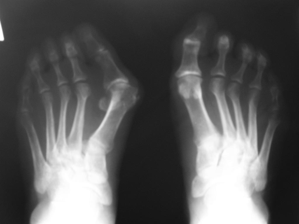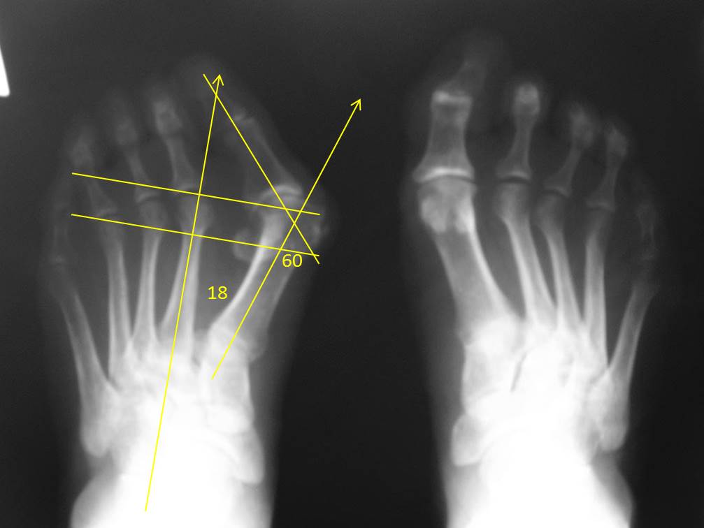 Насчет "Как по-моему должен звучать диагноз" - явная переоценка возможностей. По одному снимку ведь невозможно определить, есть ли молоткообразная деформация средних пальцев? Отклонение кнаружи 2-3 пальцев является самостоятельной деформацией или это следствие давления на них первого пальца и при прекращении давления они самостоятельно становятся на место? Ясно одно - имеется выраженная (грубая) вальгусная деформация первого пальца. Обо всех остальных компонентах деформации судить по одной рентгенограмме невзможно. Если натоптышей под головками центральных плюсневых костей нет, можно их не трогать. Все-таки по снимку имеется значительное преобладание длины первой над длинами латеральных плюсневых костей. Я сделал разметку на рентгенограмме и это сразу стало хорошо видно: перпендикуляр к оси 2 плюсневой, проведенный через латеральную сесамовидную кость расположен дистальнее середины головки 4 плюсневой (в норме проходит через середину головки), а такой же перпендикуляр, проведенный через верхушку головки второй плюсневой проходит на 2 мм проксимальнее суставного края головки первой плюсневой. В норме - первая плюсневая равна или короче второй. Так что, наиболее вероятный план - остеотомия первой плюсневой и основной фаланги первого пальца. С укорочением первой плюсневой до 2-3 мм.