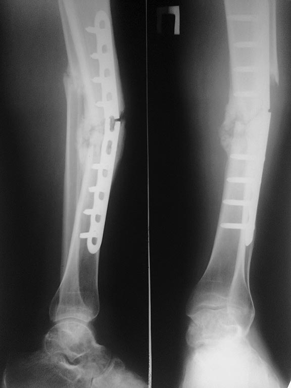 Доброго времени суток, уважаемые коллеги! Прошу помощи сообщества. Пациент 26 лет. Травма в сентябре 2013 года в результате ДТП (сбит машиной)- закрытый перелом обеих костей правой голени. Операция в соседней ЦРБ- открытая репозиция, остеосинтез блокируемой пластиной (первичные и послеоперационные снимки утрачены). Предписанный режим не соблюдал. Обратился к нам в октябре по поводу поломки фиксатора (снимок 1). Выполнено 31.10.13: удаление металлоконструкций, БИОС неканюлированным штифтом DC с рассверливанием. П/операционный период гладкий. В январе обратился по поводу возникновения болей в месте перелома, отека, появления свища на внутренней поверхности голени. 23.01.14- ревизия свища, секвестрэктомия (множество мелких секвестров в мягких тканях вокруг мозоли). В дальнейшем рана велась при помощи VAC, зажила без осложнений. Около месяца назад вновь появились боли в области формирующейся мозоли, во втянутом рубце сформировался свищ, через который эвакуировалось несколько мелких секвестров. В настоящий момент свищ закрылся, боли несколько уменьшились. В анализах- СОЭ-16 мм/час, СРБ-28, лейкоциты крови- 6,4. Последние снимки и КТ представлены. Вопрос банален- что делать дальше? Большого опыта в лечении такой патологии не имеем. Спасибо всем откликнувшимся.P.S. За качество снимков прошу прощения (снимал на телефон).