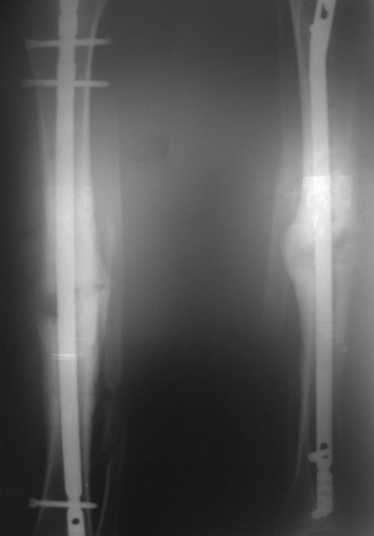 На рентгенограммах с гвоздем иммется диастаз м/у отломками б/берцовой кости, сращения м/берцовой кости похоже так же нет. Поэтому в первую очередь необходимо выполнить динамизацию. В противном случае в скором времени можно ожидать обострения воспалительного процесса, более того Вы получите как минимум перелом блокирующмх винтов, а может и самого гвоздя.