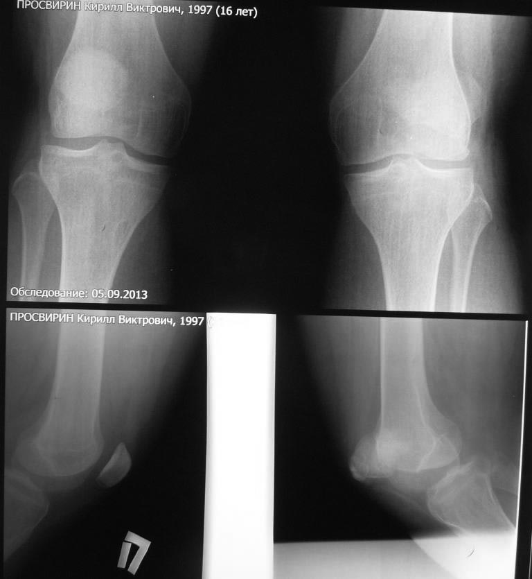 Крупный ребёнок 16 лет. Избыточный вес. Не заинтересован в физических нагрузках. Обратился с жалобами на боли в левом коленном суставе при ходьбе. В 2011 году находился на стационарном лечении в нашей кинике по поводу застарелого перелома внутреннего края левого надколенника с разрывом капсулы сустава, хондромаляции наружного мыщелка бедра и гемартроза. За год до госпитализации перенёс двукратный спонтанный вывих левого надколенника. В отделении (март 2011 года) выполнена артроскопия, санация гиалинового хряща наружного мыщелка. Артропластика по Кемпбеллу. Рентгенограммы той поры не сохранились. Через 2 месяца после оперативного лечения ребёнок находился в отделении по поводу послеоперационной-посттравматической разгибательной контрактуры коленного сустава.
