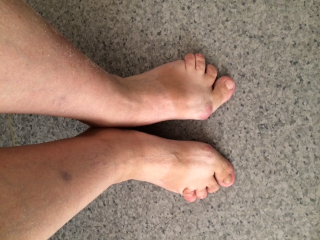 Пациентка предъявляет жалобы на боль в плюсне-фаланговых суставах, невозможность ношения закрытой обуви. Имеются умеренные натоптыши в проекции 5-ых плюснефаланговых суставов стоп.