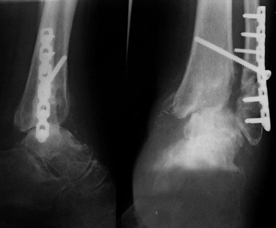 Уважаемые коллеги!Больная, 57лет, травма 2 года назад, переломы обеих лодыжек, выраженные фликтены, длительный(около месяца) предопер. период. Неустраниимый подвывих стопы кнаружи и кзади. Открытая репозиция, синтез лодыжек, трансартикулярная фиксация спицами. Удаление спиц через 8 недель с рецидивом подвывиха. Повторная операция, трансартикулярная фиксация, вновь рецидив подвывиха. В июне 2013 года- ревизия голеностопного сустава, удаление свободных фрагментов суставной поверхности б/б кости, ревизия дельтовидной связки, устранение транспозиции сухожилия по медиальной лодыжке, устранение подвывиха, накостный синтез с установкой позиционного винта. Сегодня такая картина. Жалобы на постоянные боли. Сгибание -разгибание 10 градусов. Планируем резекцию суставных, артродез с фиксацией канюлированными винтами через пяточную кость. С последующей гипсовой иммобилизацией на 3 месяца. Раздумываю над АВФ. Хотелось бы узнать мнение о тактике, исходя из вашего опыта лечения таких больных. Спасибо.
