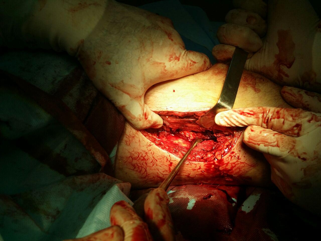 В экстренном порядке взяли на ревизию, и тут все началось - гнойные затеки по всему бедру, по всем костно-мышечным каналам бедра до в/3, книзу доходит до заднего отдела сустава.
