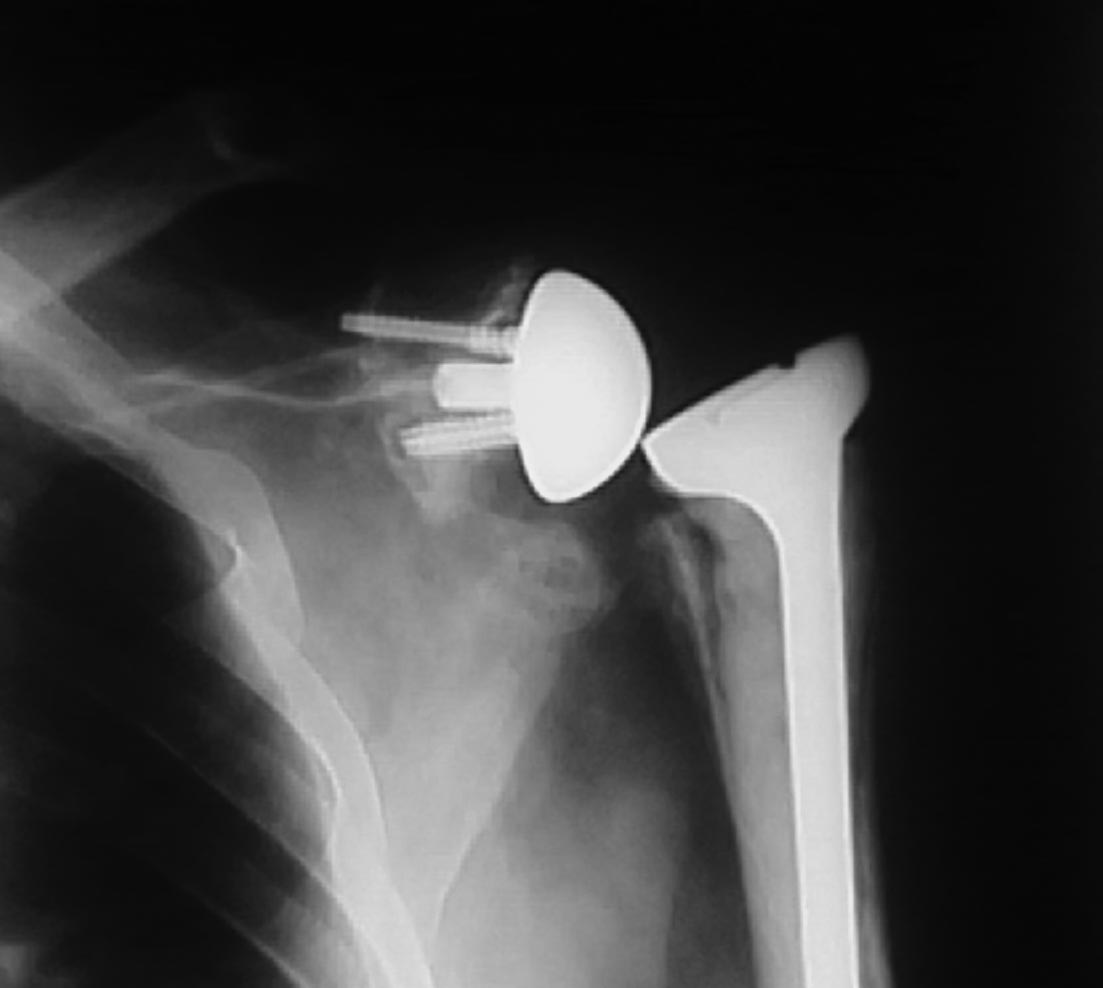 Мужчина 56 лет,после реэндопротезирования по поводу асептического некроза головки плечевой кости,обратился на приём с жалобами на ограничение движений в плечевом суставе,вот какую рентгенологическую картину я увидела.