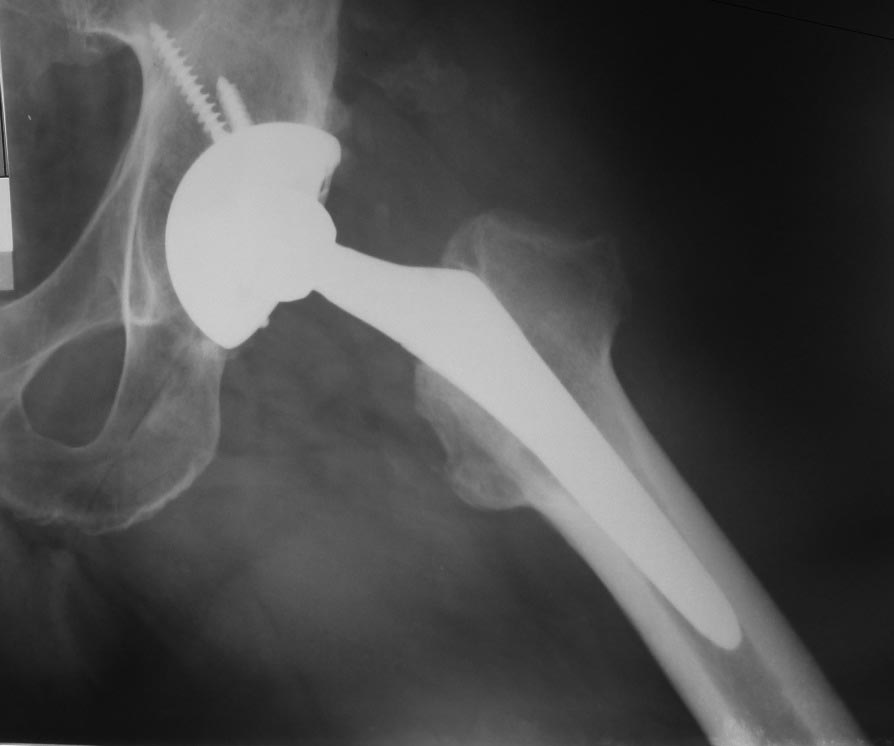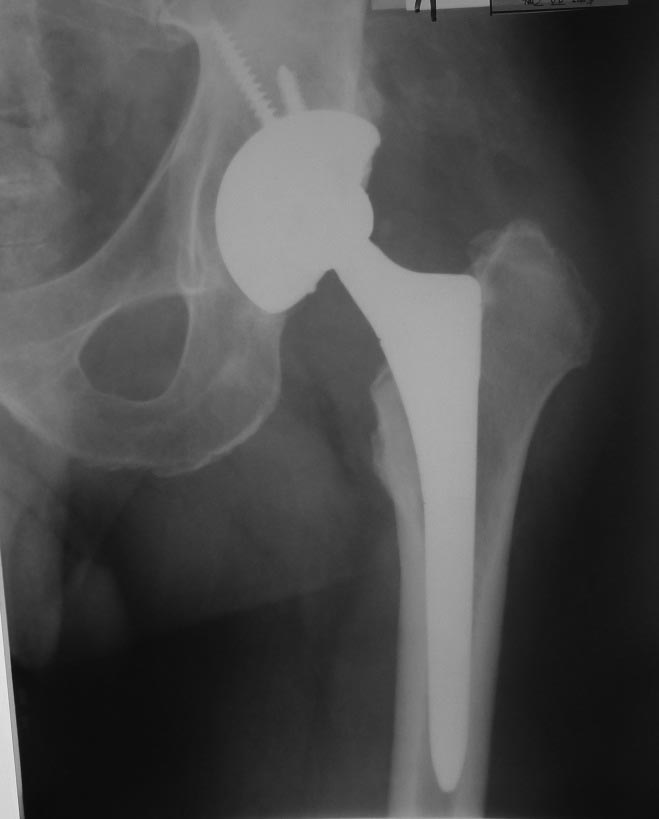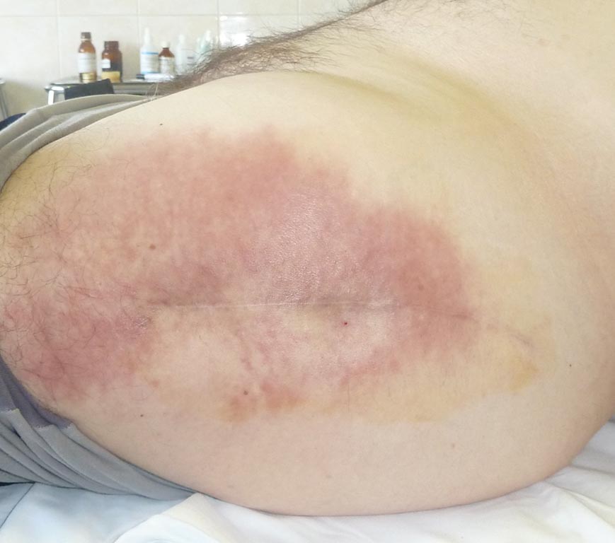 Уважаемые коллеги. В сообщении от 02 июля 2013 г. я уже писал об этом случае. Эндопротезирование пациенту 49 лет выполнил в 2007 г. по поводу коксартроза. В начале мая 2013 г. в состоянии запоя он упал со скамейки, после чего отметил припухлость в области паха и левой ягодицы. За помощью обратился почти через 2 мес. При пункции было удалено около 200 мл стерильной гноеподобной жидкости из области эндопротеза. За несколько дней жидкость снова набралась. 04.07.13 произведена санация гнойной полости с последующим вакуумированием раны. Во время операции признаков нестабильности и износа компонентов протеза, а также дебриса выявлено не было. Заменить полиэтиленовый вкладыш не удалось из-за неисправного запорного механизма. 08.07.13 выполнена пластика раны местными тканями. Дренаж удален через день. На фоне гладкого послеоперационного периода, 17.07.13, вследствие нарушения режима, произошел вывих головки эндопротеза, вправленный в тот же день закрыто. Послеоперационная рана зажила первичным натяжением, выписан 29.07 с рекомендацией ходить в ортезе при помощи костылей с частичной нагрузкой на левую ногу до 1 мес. после вывиха эндопротеза. Через неделю снова «ушел в запой» и был госпитализирован с очередным вывихом протеза. Подобные эпизоды повторялись до декабря 2013 г. еще 5 раз. Каждый раз удалялось до 100 мл стерильной серозногеморрагической жидкости. При последней госпитализации была отмечена гиперемия дистальной 1/3 послеоперационного рубца. Впоследствии пациенту удалось победить порочное пристрастие. Сейчас работает по специальности (водитель), при длительной ходьбе и к концу рабочего дня отмечает дискомфорт или легкую болезненность в области тазобедренного сустава. Наблюдаю его с интервалом в 2-3 месяца. Каждый раз пунктирую область эндопротеза, последние 2 раза жидкости практически не было. СОЭ – 25-40, С-рб до 15-20. Мыслей о замене протеза сейчас нет. Последние (июньские) рентгенограммы – без особенностей (прилагаются). Смущает только обширное синюшно-розовое пятно с отечной кожей (на фото), появившееся в декабре 13 г.: признаком чего оно может являться? Имеет ли прогностическую ценность? Встречался ли кто-нибудь с подобным? Заранее спасибо за ответы.