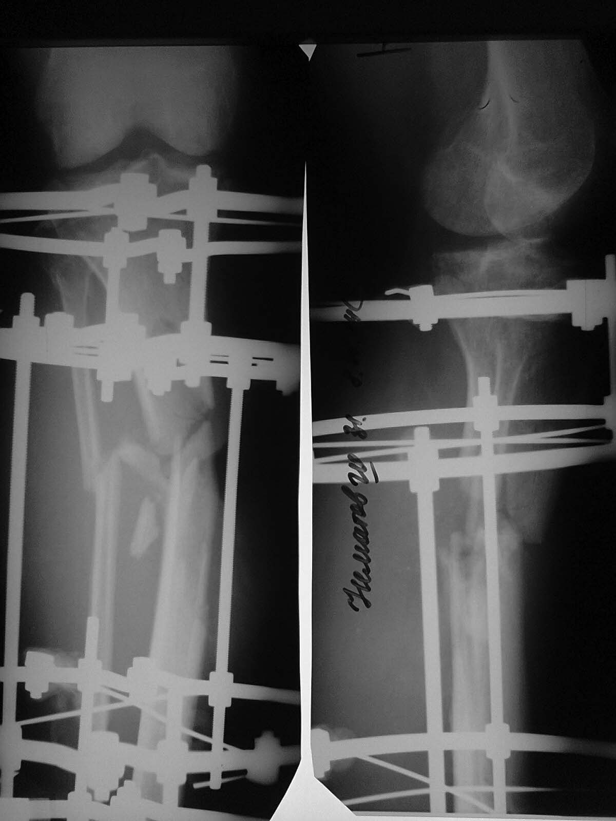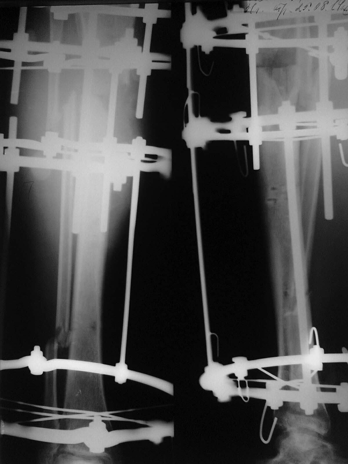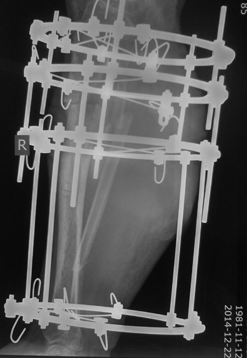 Доброго времени суток, уважаемые коллеги!Прошу Вашей помощи в лечении пациента Н. Пациент, 33 г. Травма в мае 2014 года в результате ДТП (сбит машиной). Оперирован в институте (или центре) травматологии и ортопедии одной из среднеазиатских республик (уроженец этой республики). Обратился к нам в августе, по поводу наличия гнойной раны внутренней поверхности голени с обильным отделяемым. (Рентгенограммы- фото 1). Выполнено: остенекрсеквестрэктомия, резекция концов отломков, перемонтаж аппарата (фото 2). Рана успешно зажила, пациент исчез из вида. Неделю назад пришел снимать аппарат с рентгенограммами (фото 3,4). Ходит с полной безболезненной нагрузкой на конечность, АВФ стабилен, раны от опорных элементов спокойны, отек конечности умеренный, в проекции бывшей гнойной раны- втянутый рубец (если необходим внешний вид конечности, то смогу выложить на следующей неделе,наверное). Учитывая большой дефект кости по задней поверхности кости, боимся, что при нагрузке без аппарата произойдет перелом. Вопрос: что делать? Наши варианты: 1.снять АВФ, рассверлить канал, установить штифт с антибактериальной мантией в виде "протеза" кости; 2.Резекция дефектного участка, остеотомия в н/3, перемонтаж АВФ и билокальное замещение дефекта. Что Вы посоветуете? Спасибо всем откликнувшимся.