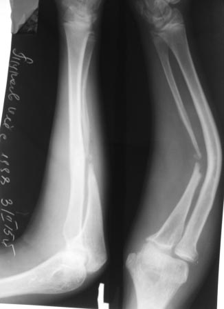 Добрый день, уважаемые коллеги. По моему вы недостаточно серьезно оцениваете имеющуюся ситуацию. При первом взгляде на рентгенограммы возникает только одна аналогия - латентный ложный сустав костей голени. Тот же дефект малоберцововй кости, та же дугообразная деформация большеберцовой кости. Можно лишь гадать о том, что послужило пусковым механизмом развития такой деформации костей предплечья, но сейчас вы имеете дело с явным нейротрофическим нарушением на данном сегменте.