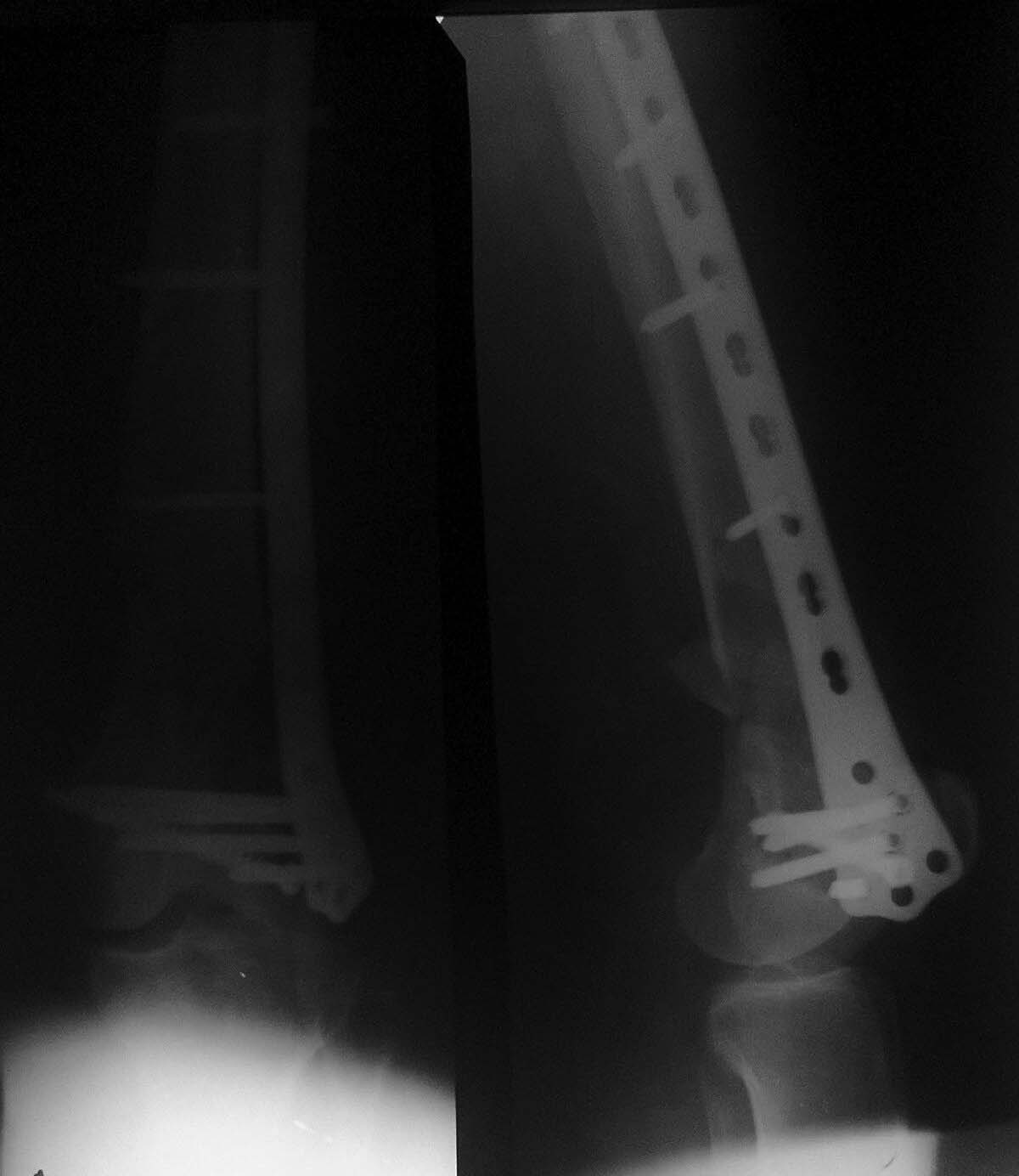 Удалять разрушенный имплантат более травматично и трудоемко, чем целый.Так что мы сейчас предочитаем в такой ситуации малоинвазивное удаление пластины и закрытый интрамедуллярный остеосинтез. Здесь бы сделали антеградный. Без костной пластики.
