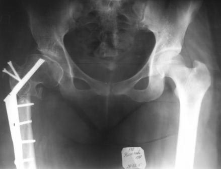 Уважаемые коллеги, обратилась девушка 1991г.р. 2 года назад оперирована в другой области по поводу диспластического коксоартроза ( похоже Мак Маррея, фиксация ЦИТО –Бакичарова), вот уже почти два года ходит с двумя костылями, наступать на ноги не может из-за боли, ногу активно поднять не может, активные движения в т/б суставе резко ограничены из-за боли, пассивные: 5/0/90гр, приведение - 20, отведение - 10гр, ротация-около -30, но болезненная. беспокоят боли в основном в обл ложного сустава, при движениях и пальпации в обл т/б сустава болей нет.