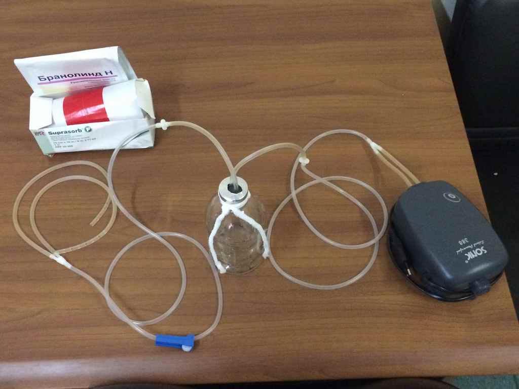 P.S. Из практики. Не вынимайте банку из отсоса и не ставьте на пол отдельно - пациент ее обязательно уронит и в отсос попадет отделяемое из раны. Лучше поставить весь аппарат, подсоединив к банке аквариумный отсос.