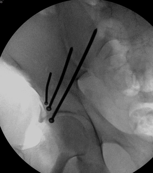 Фиксация переломов передней колонны намного легче, чем остальных переломов вертлужной впадины. Любой доступ: Smith Petersen, Stoppa или ilio-inguinal. Как фиксировать перелом зависит от желания врача, можно пустить пластину по pelvic brim (linea terminalis) или более щадящее из верхнего окна пластиной, а переднюю колонну длинными межколонными винтами.