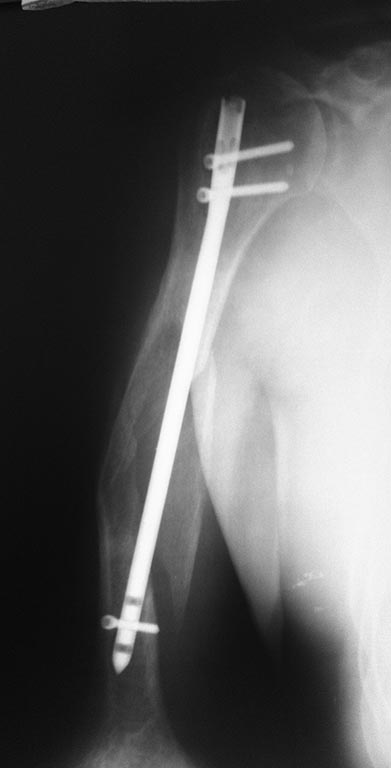 Некорректное стояние импланта, недостаточная длинна и отсутствие стабильной фиксации короткого(дистального) отломка.Ре БИОС, с рассверливанием канала, с использованием штифта больших диаметра и длинны, отталкивающих спиц, если потребуется, дистальная фиксация минимум 2-мя винтами, в случае достаточного контакта основных отломков и учитывая атрофический характер ложного сустава проксимальная блокировка по компрессионной схеме + осевая нагрузка (трость). Результат должен быть хорошим.