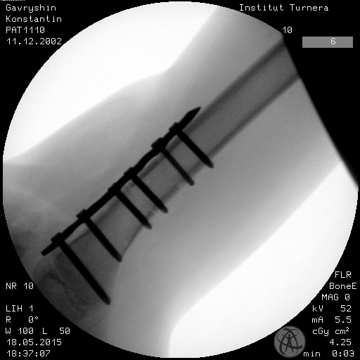 Здравствуйте. Пациент: 12 лет. Последствия родового повреждения плечевого сплетения. Внутриротационная контрактура плечевого сустава. Выполнена операция: деротационная остеотомия плечевой кости, синтез пластиной ChM, 3.5. Прошу оценки адекватности выполненного синтеза: смущает то, что первые два винта перфорируют кортикал частью, не имеющей нарезки. Хоть оба и стоят в метафизарной части. Старался, чтобы свободная часть винта не была слишком длинной - может не следовало? Спасибо.
