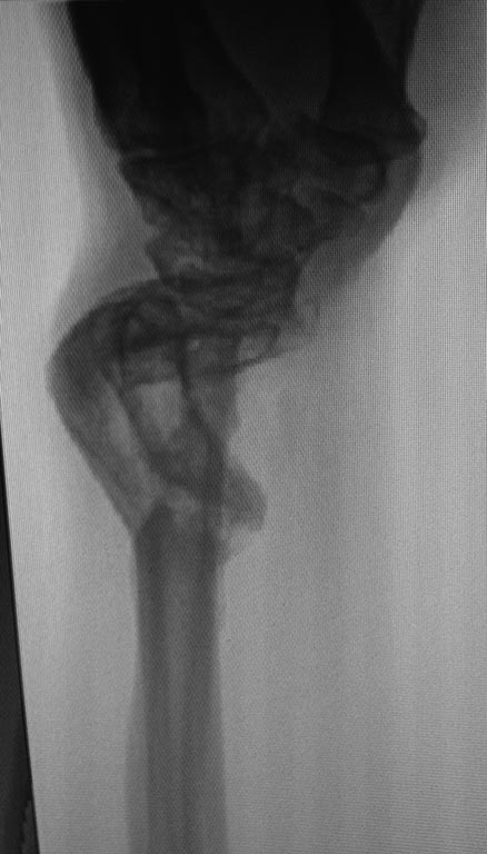 Пациент получил огнестрельное ранение левого предплечья с переломом обеих костей в нижней трети в августе 2014г. Первоначально лечился в аппарате Илизарова. Со слов пациента, в связи с развитием ИО в область проведения спиц аппарат демонтирован, продолжено лечение в повязке.
