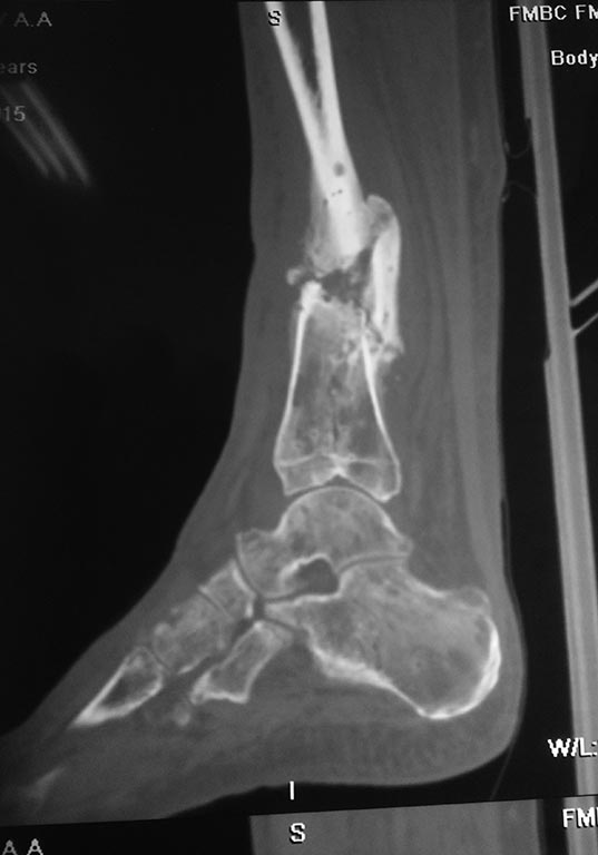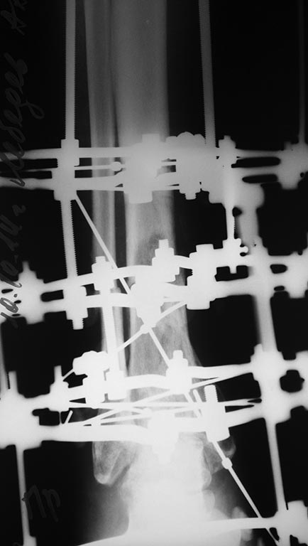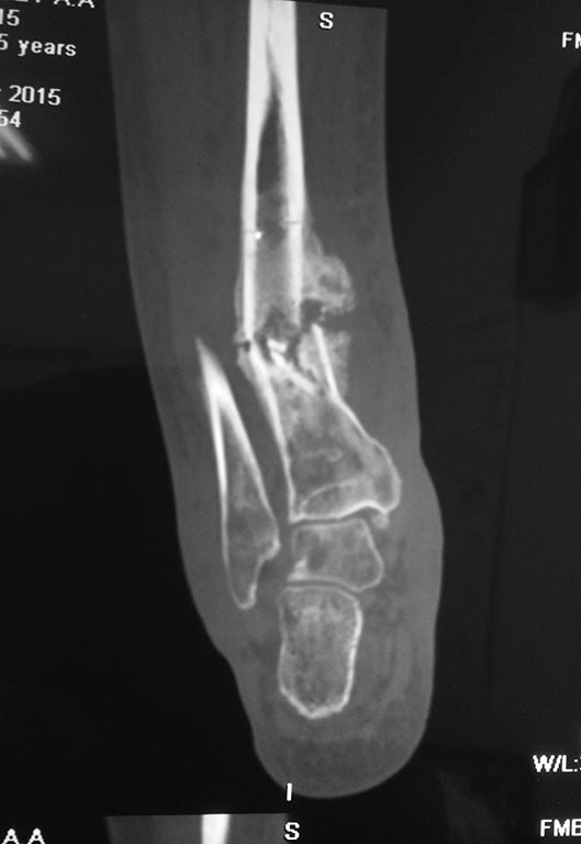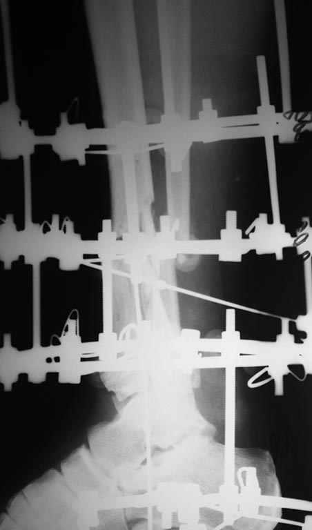 Небольшое уточнение: оперирован 1 августа, в ноябре снята база со стопы, в конце декабря демонтаж аппарата. Показания к снятию аппарата- заключение рентгенолога - консолидирующийся перелом, отсутствие патологической подвижности. Рана заживала около 3 -х месяцев условно первичным натяжением. Так как нет КТ руководствовались в основном рентген снимками.
