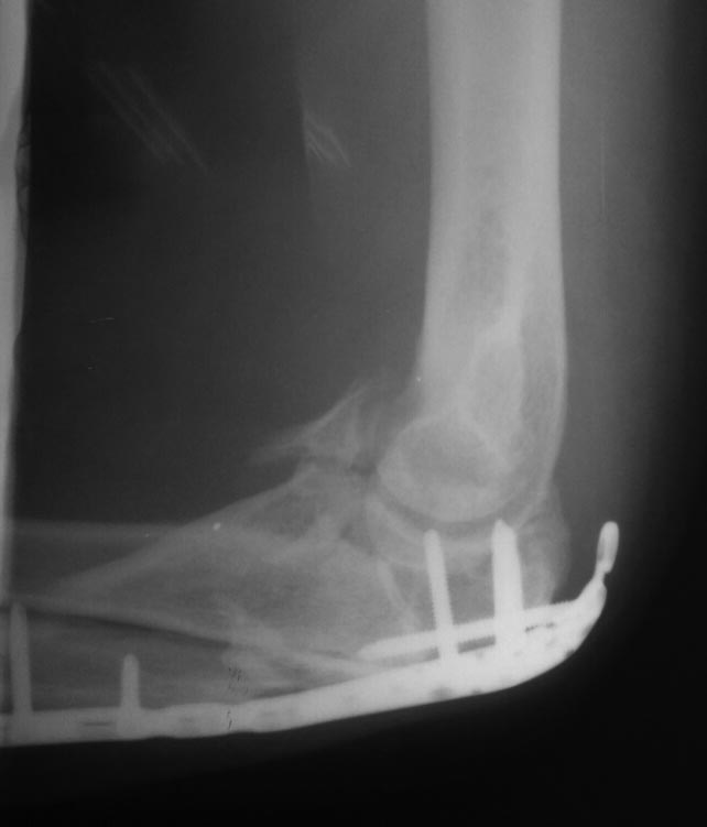 Консолидированный перелом проксимального отдела локтевой кости в условиях накостного остеосинтеза. Сросшийся перелом венечного отростка от февраля 2015. Отмечается консолидация венечного отростка,между отломков около 0.8 см рубцовые ткани. Выделение венечного отростка, рубцовые ткани удалены. Остеосинтез венечного отростка двумя винтами "типа Герберта". Интраоперационно разгибание 180, сгибание 125-130. Хотелось узнать ваше мнение < | >