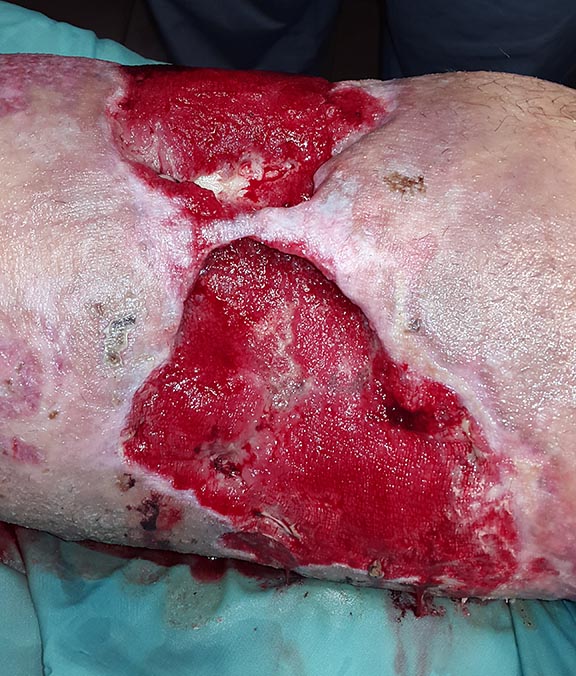 Под воздействием вакуума образовалась готовая к кожной пластике грануляционная поверхность, но не стал бы спешить, потому что посаженная на кость кожа имеет плохое питание и легко травмируется. В данном варианте, кроме закрытия дефекта необходимо решить проблему сращения кости, потому что в зоне с пониженным кровообращением восстановление происходит медленнее и в большинстве открытые, инфецированные переломы осложняются атрофическим ложным суставом!