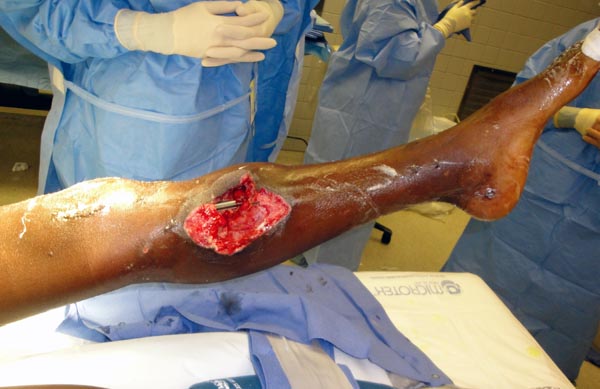 инфецирование раны и, не ожидая закрытия дефекта, можно проводит фиксацию даже внутрикостными фиксаторами. Затем можно продолжить процедуры по закрытию мягкотканннего дефекта.