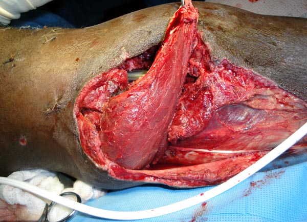 У нас отличные пластические хирурги, однако, пластику местными тканями их сдерживает то, что медиальное брюшко поперечно повреждено, т.е. есть возможность только отдаленного лоскута на сосудистой ножке.
