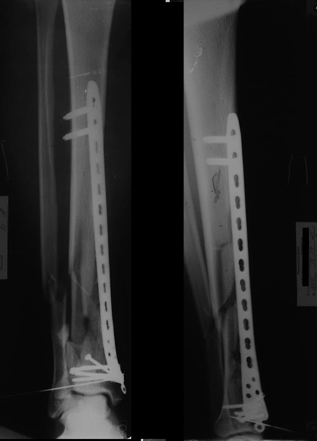 Уважаемый Кирилл предоставил отличный послеоперационный снимок. Мой хуже, конечно. Но без ЭОП и через два разреза вышло вот так.
