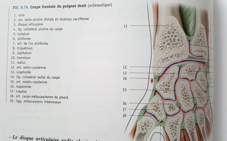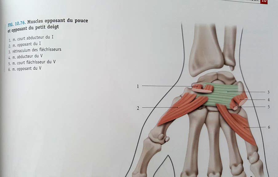 С точки зрения анатомии,чтобы оправдать выбранную мной иммобилизацию, лучевая девиация расслабит действие коллатеральной карпальной связки которая крепится к шиловидному отростку лучевой кости и ладьевидной кости (рисунок 9.76, номер 14), а оппозиция первого пальца расслабит его короткую отводящую мышцу которая тоже крепится к ладьевидной кости(рис.10.76 номер 1).