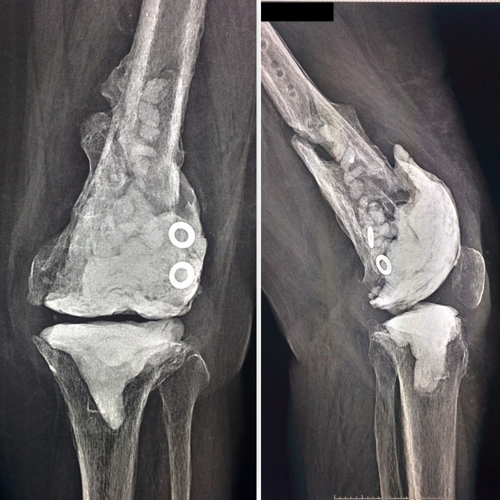 Тогда наиболее надёжным вариантом мне представляется онкологический эндопротез, замещающий дистальный отдел бедра.
