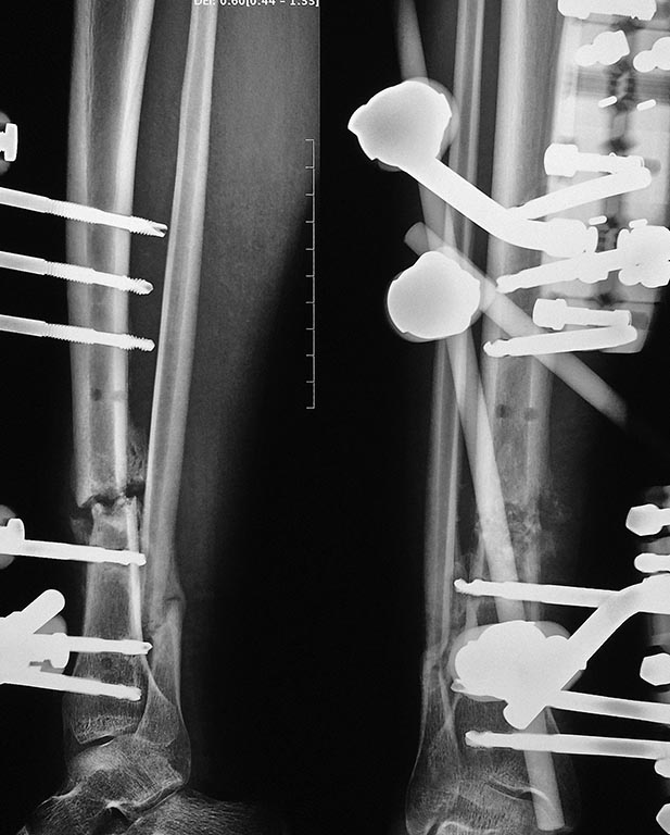 С учётом возраста больного, перенесённой тяжёлой сочетанной травмы и длительного ношения АНФ, так и просится БИОС с рассверливанием. Больной получит опорную ногу и на гвозде можно будет в последующем выполнять при необходимости костную пластику. Остеосинтез можно сделать с одномоментным резекционным укорочением костей голени. На том же гвозде потом можно удлинить.