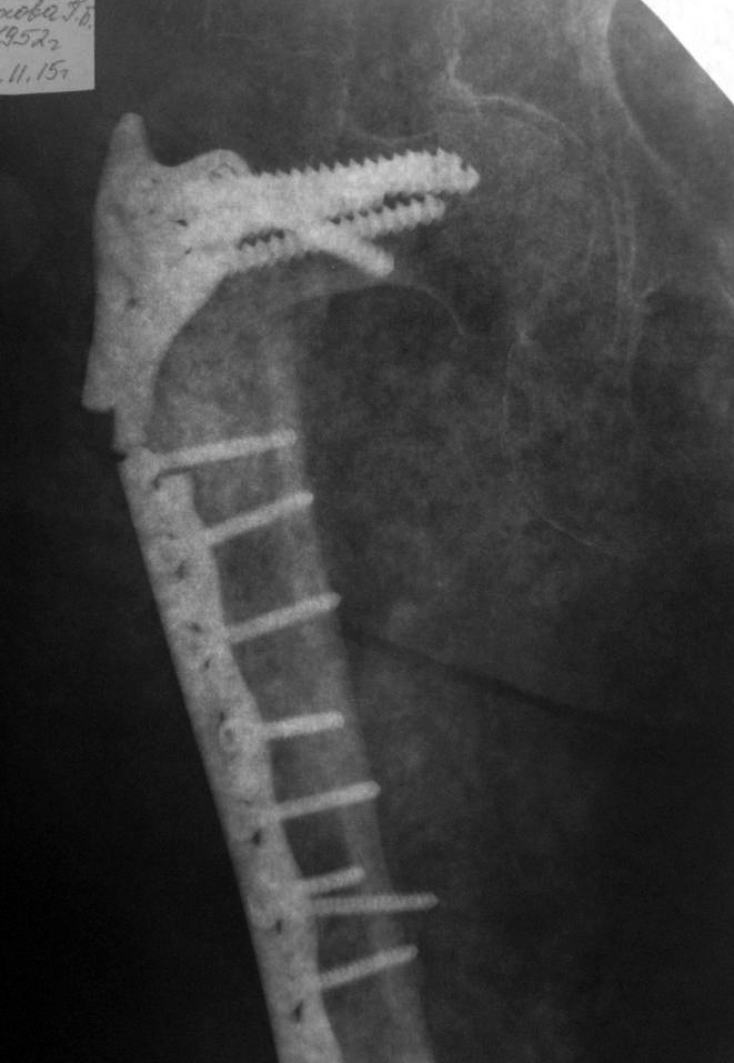 из БСМП г. Дзержинск Здравствуйте, уважаемые коллеги! Прошу Ваших мнений по следующему случаю. Женщина 63г. Травма в январе 2013г, тогда же оперирована по поводу чрезвертельного перелома бедра DHS (снимки отсутствуют). 3 недели тому - при сгибании бедра (стригла ногти) почувствовала хруст, выраженный болевой синдром, потеря опороспособности, рентгенологическая картина представлена.Сопутствующая патология: ревматоидный артрит с поражением суставов стоп, кистей. Принимает постоянно в течение нескольких лет метатрексат и преднизолон. Анемия Hb-около 90 г/л. Планируемое лечение: 1.) отмена или снижение дозировок метатрексат, преднизолон. 2.) коррекция анемии 3.) Оперативное лечениес удалением металлоконструкции и с использованием 3.1 )конструкции типа PFNA максимально возможной длины. 3.2) Предложен еще вариант эндопротезирования с длинным бедренным компонентом. Буду благодарен за участие в судьбе моей родственницы. Извините за качество снимков.