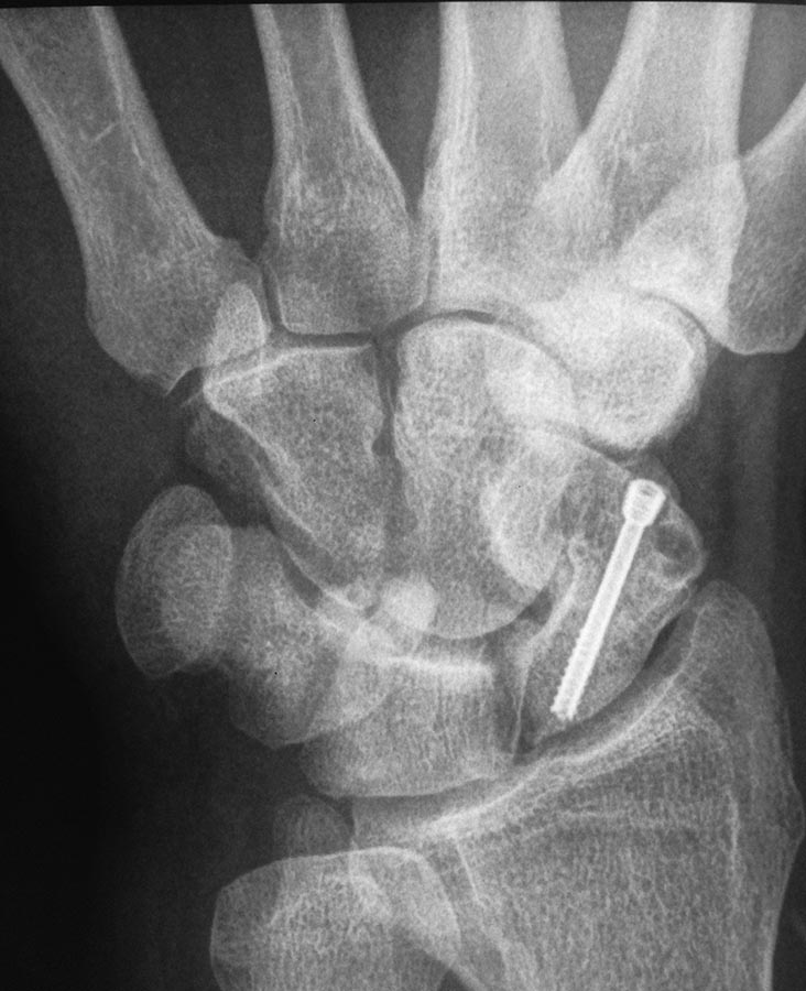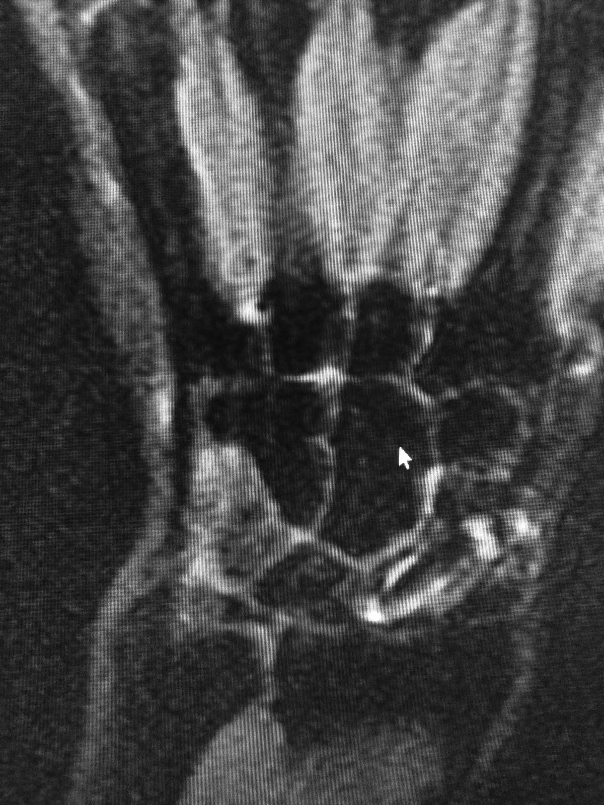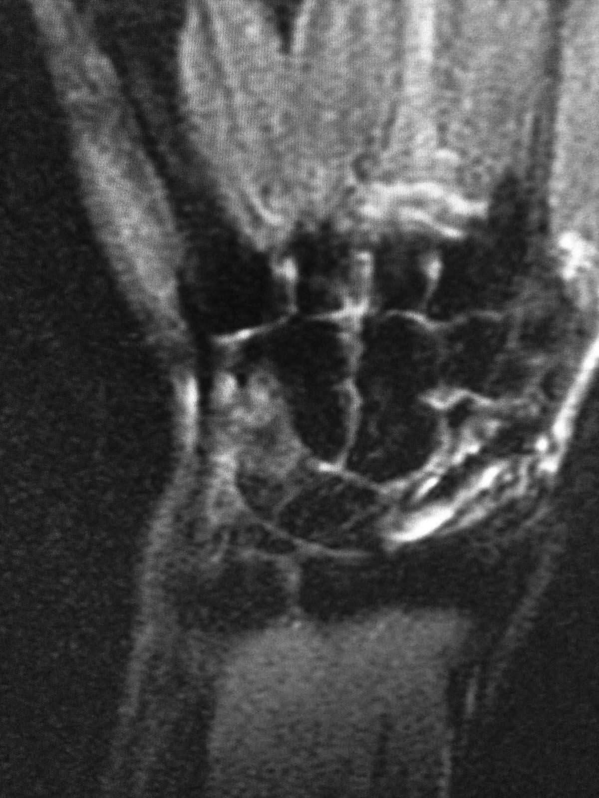 Эльдар, по предоставленным срезам МРТ и описанной клинике сложно судить о состоянии связочного аппарата (в частности полулунно-трехгранной связки) и треугольного фиброзно-хрящевого комплекса (в частности суставного диска), повреждение которых могут давать описанные жалобы. Возможно, в описании МРТ что-то сказано об этом? Что можете сказать о тестах, выявляющих повреждение указанных образований? И все-таки боли возникают периодически или всегда сопровождают движения в кистевом суставе? Болит ли в покое? Андрей, Ваша логика совсем не ясна. Что общего между обсуждаемым пациентом и "стенозом лучевого запястного канала", кроме когда-то сломанной ладьевидной кости? Сергей, с хондроматозом тоже не ясно. Вы его видите на имеющихся снимках? Хондроматоз сустава - показание для удаления одной из образующих сустав костей? SAGo, в сообщении Эльдара нет указания на то, что болит больше всего по тыльной поверхности трехгранной кости.