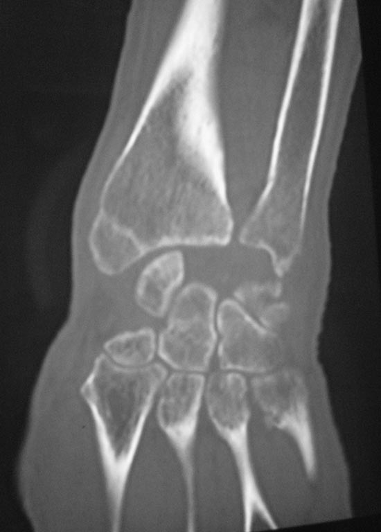 Поступил пациент В, 49 лет. С жалобами: на ограничение движение в правом лучезапястном суставе, на жжение в пальцах правой кисти в ночное время. Анамнез: получил травму 25.12.2015 г. лечили амбулаторно перелом лучевой кости, наложена гипсовая лонгета. После снятие гипса легча не стало. Амбулаторные снимки прилагаются. Выполнили КТ DS: признаки вывиха полулунной кости, срастающийся перелом лучевой кости дистального эпифиза, трехгранной кости. Нужна помощь в тактике лечения.
