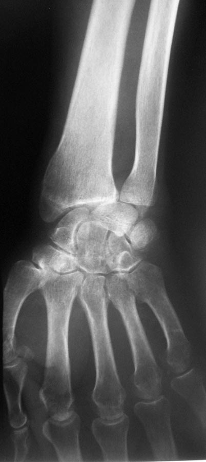Коллеги, пожалуйста, покажите, где на снимке вывих полулунной кости. Я фиксирую 1 спицей, на 6 нелель, после открытого вправления. По букварю, необходима дистракция перед вправлением.