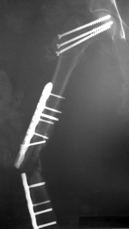 Добрый день уважаемые коллеги, представляю вам случай поломка пластины и бедренной кости, девушка 32 года оперирована 6 месяцев в другом городе, шейка бедра винтами и бедренная кость пластиной, около 1 месяца назад начала ходить с полной нагрузкой, 18.02.16г почувствовала резку боль в бедре после чего доставлена к нам. Предполагаем удаление металла и БИОС бедренной кости. Стоит ли делать костную пластику? Какие будут советы дополнительно в плане лечения?