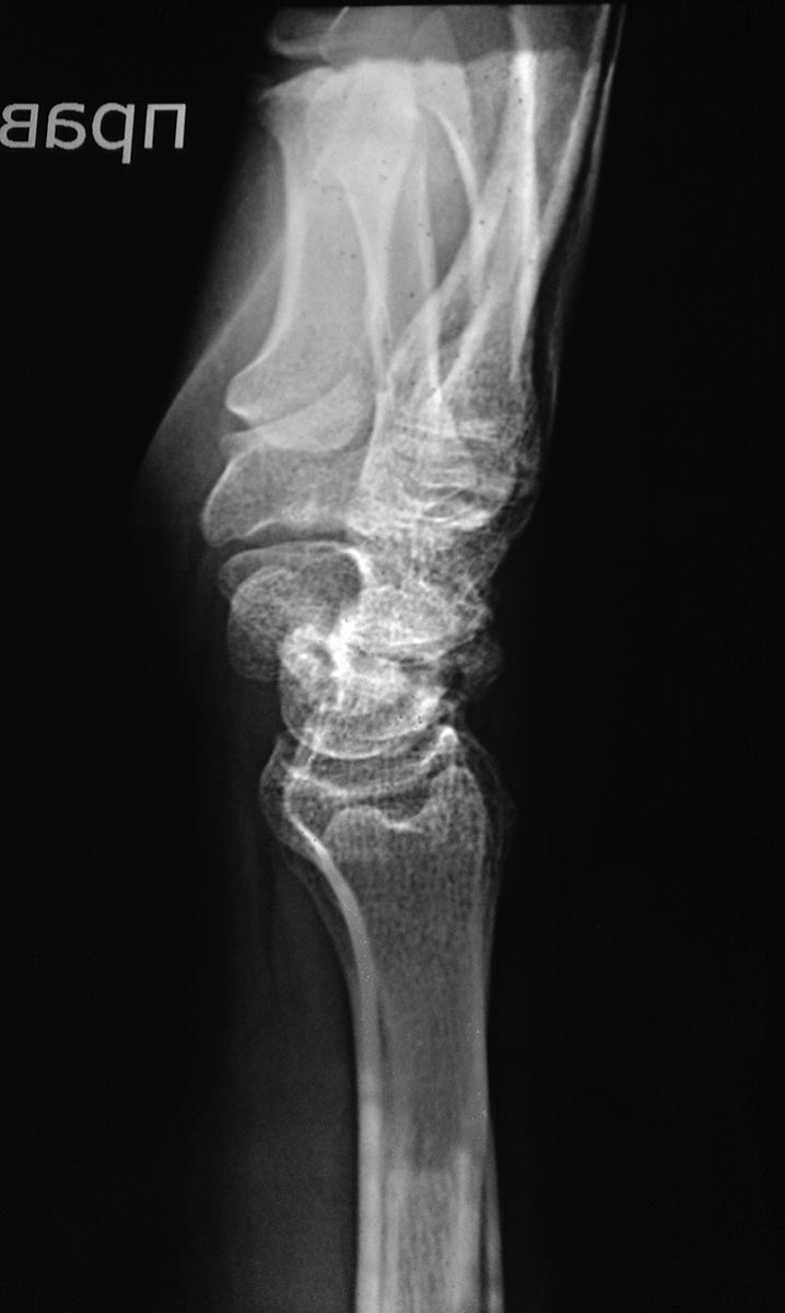 2. Вариант костной пластики: в связи с достаточно значимым имеющимся дефектом костной ткани и деформации по типу humpback уместна костная пластика трансплантатом с ладонной поверхности лучевой кости кровоснабжаемым карпальной артерией, популяризированный французским профессором Mathoulin, единственное использовал бы фиксацию спицами, а не винтом, т.к. уж очень нежный трансплантат.