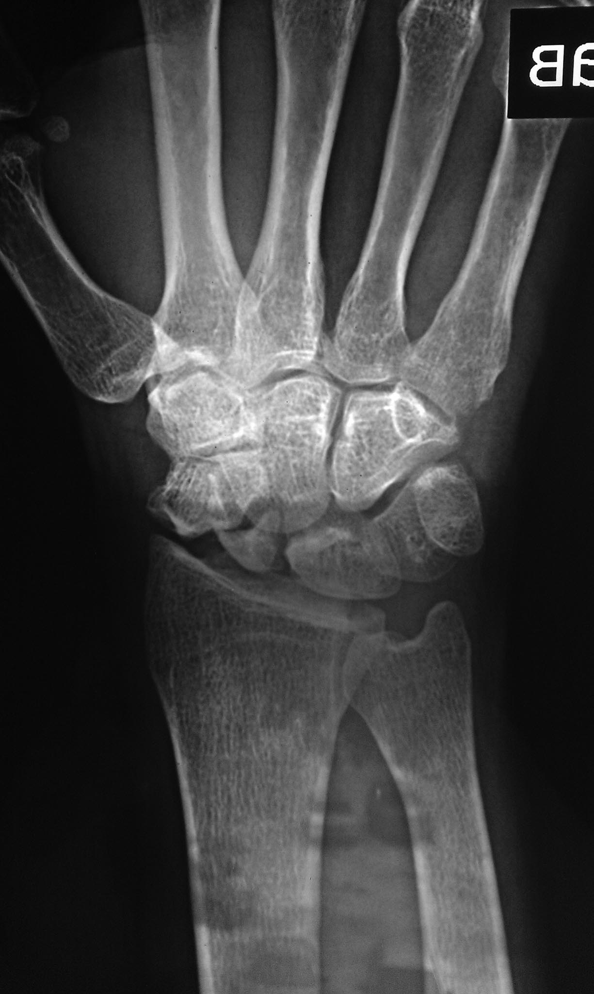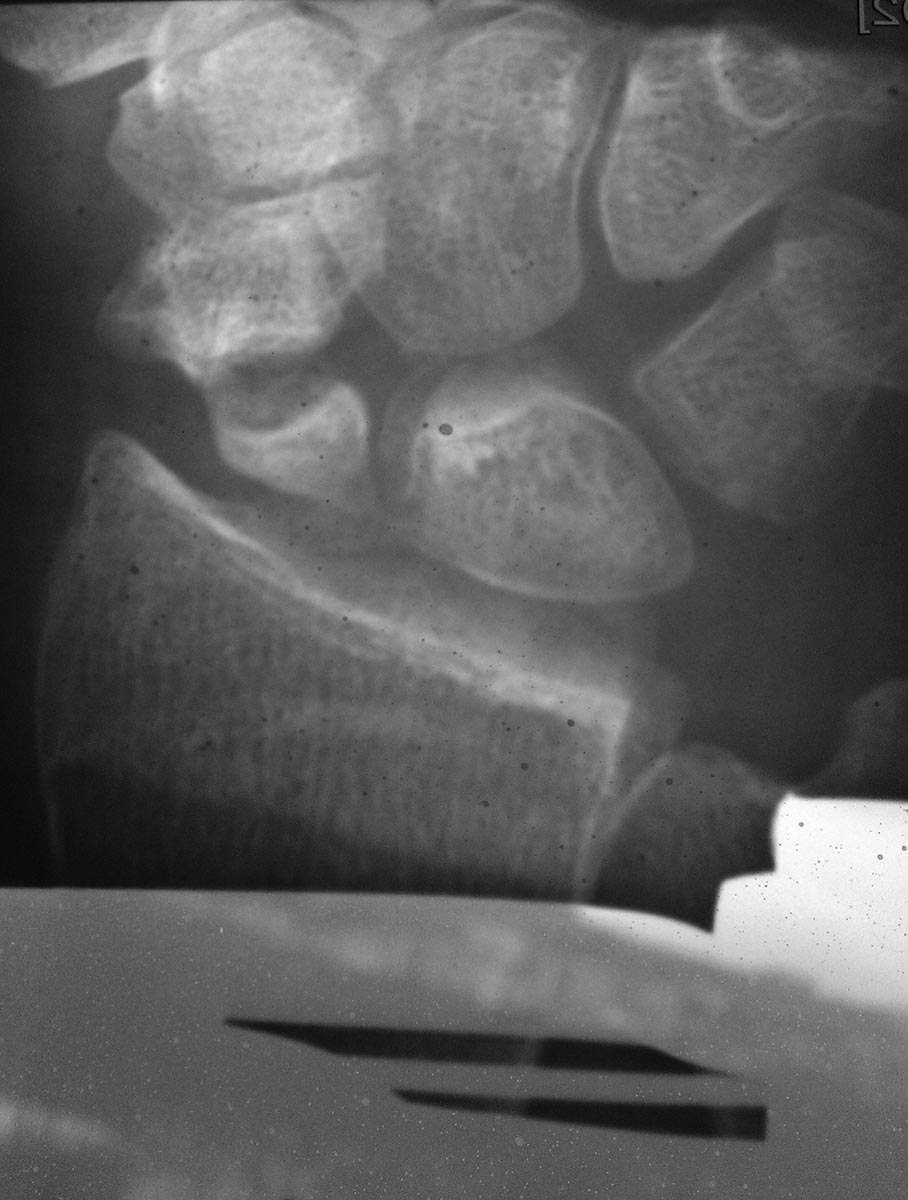 Сомнения есть, что написано доктором. Травматолог предоставил бы диагностические Rg-граммы в двух проекциях после репозиции, озадачился бы компьютерной топографией запястья. А, у травматологов в ординаторской есть негатоскоп и фото рентгенограмм лучше выполнять с него, чтобы не изучать припаркованные машины за окном. Судя по снимку: что-то с ладьевидной костью.