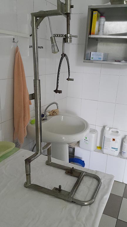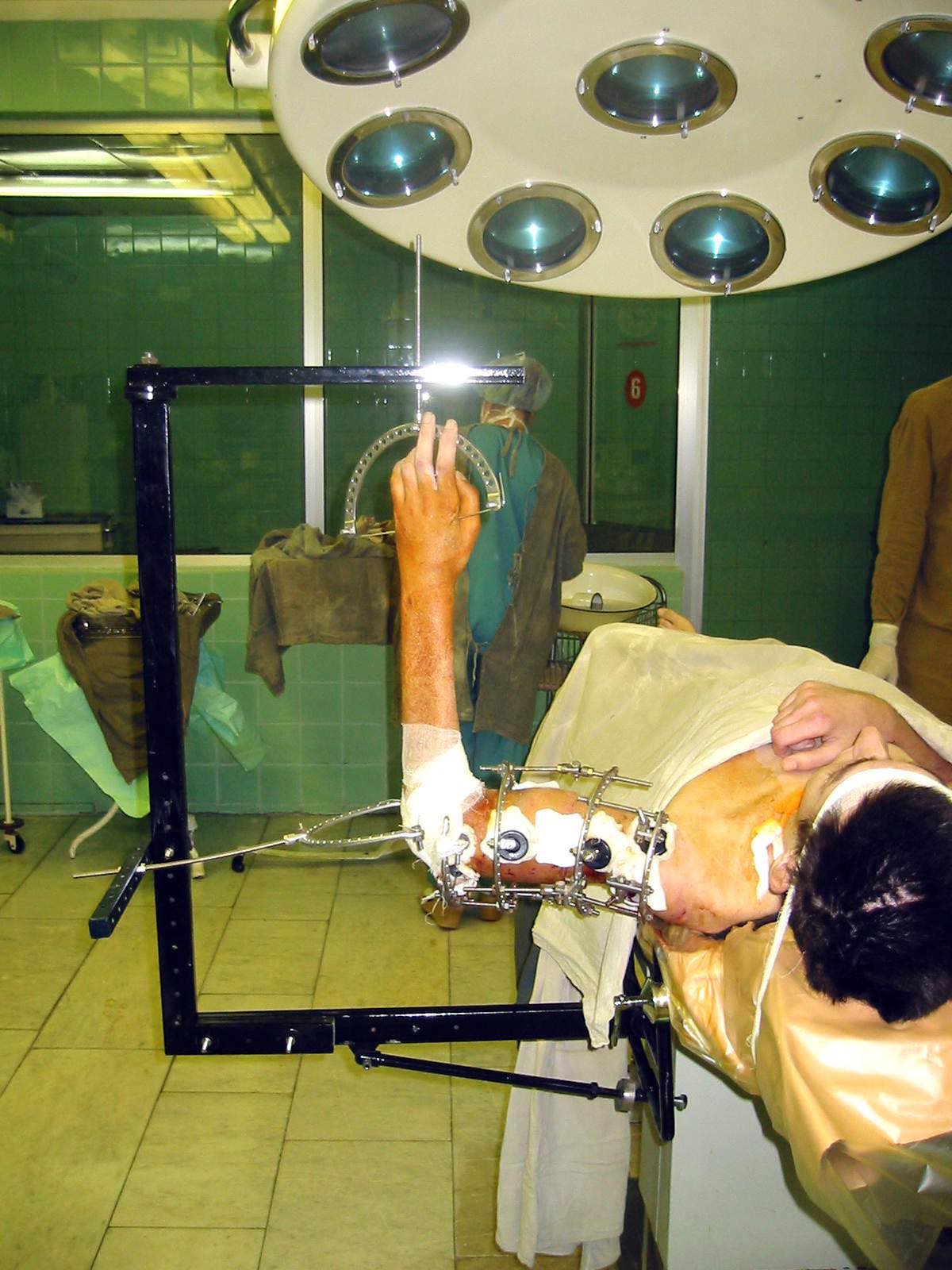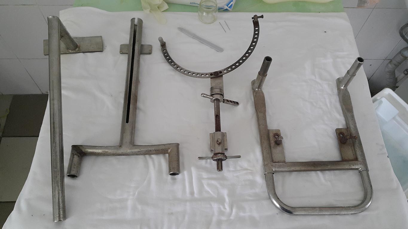 Вот наше "изделие". Делали давно (лет 8 назад, фотографии того времени) в автосервисе. Изготовление заняло один вечер накануне операции. Крепится двумя стандартными зажимами к хирургическому столу. Устройство зарекомендовало себя хорошо.