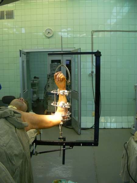 Уважаемый Эльдар,я наложил приличное кол-во аппаратов Илизарова на плечо, и приставки к столу разные наблюдал в различных учреждениях,но не заморачивался. Прекрасно служила "приставкой" передвижная лампа,иногда её называли "гусь". Советские лампы имели чугунную станину и это было то,что нужно. На штатив по серединке крепились 2 балки от Илизарова,через которые перебрасывался тросик от скелетного вытяжения за локтевой отросток. Потом и ролик зафиксировал. Кисть и предплечье фиксировались мягким бинтом к горизонтальному кронштейну. Играя высотой стола,положением лампы и поворотом горизонтальной консоли лампы можно было добиться нужного положения.Штатную приставку для руки фиксировал к столу в перевернутом положении на которую сверху ложилась кассета. К ней же с боку крепился импровизированный кассетодержатель для боковых Р-грамм.Вот и всё. Ей богу,удобней любой приставки. Сегодня правда не везде сохранились те,советские лампы,но может где и есть. Чертежей наверное не потребуется,да? Очень надеюсь,что совет пригодится. Удачи.
