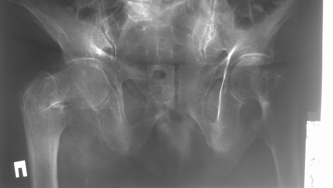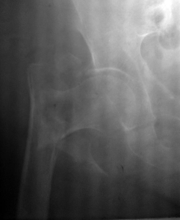 А мне кажется, что это не базальная шейка и даже не чрезвертельный, а межвертельный перелом бедра с отрывом латерального края большого вертела. Что то похожее - на картинке.