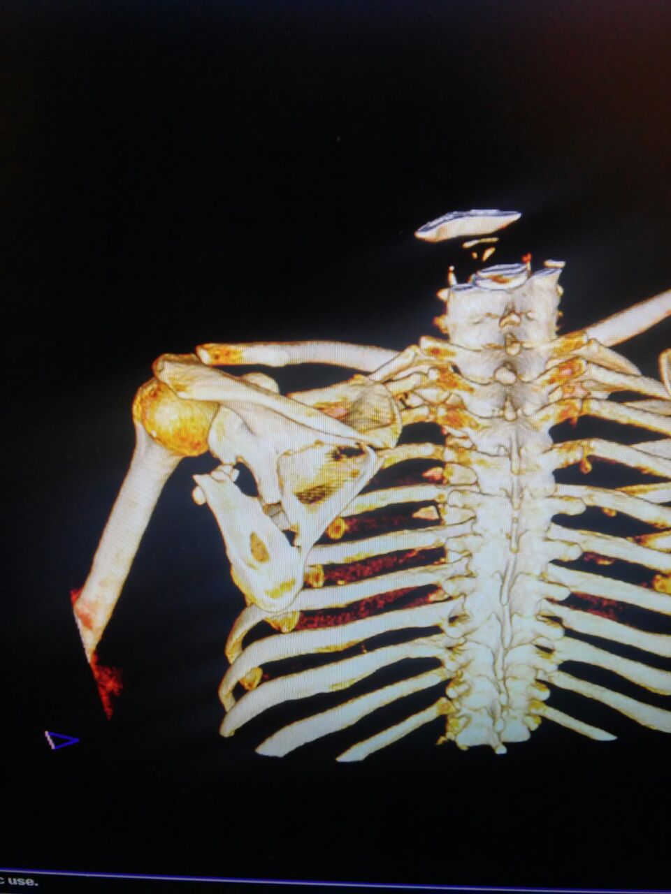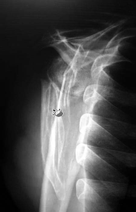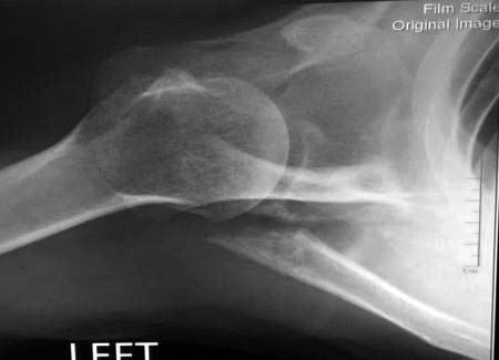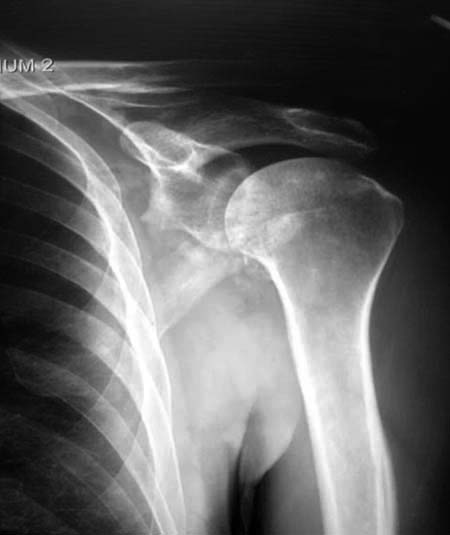 Данный перелом относится к перелому тело лопатки и несмотря на наслоение, где лопатка покрывает грудную клетку, но можно увидеть три большие фрагмента, которые находятся в разных плоскостях. Суставная поверхность расположена намного медиальнее, что нарушает бланс мышц, которая в последующем может привести к ограничению движения верхного пояса. Расположение суставной поверхности нуждается в уточнении дополнительными исследованиями, включая КТ и стандартные снимки плеча.!
