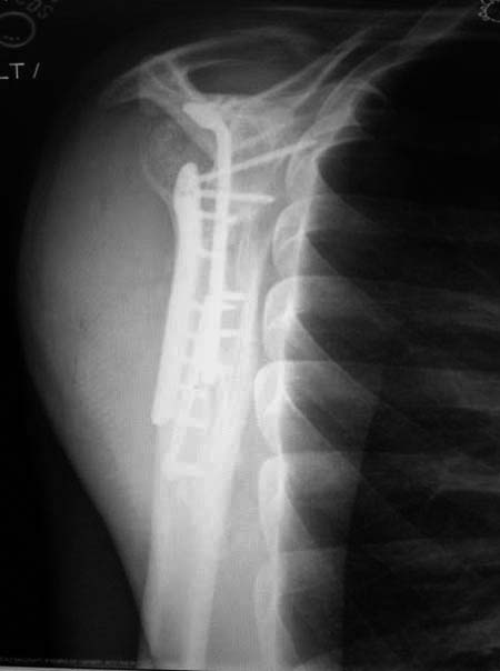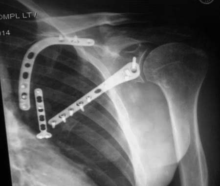 Здесь пример, стандартные снимки: плечо и лопатка прямой снимок, аксиллярный и косой снимки (Y-view) и фиксация пластинами по краям, где имеется более твердая кость. Специальные пластины, хотя любая 2.7 или 3.5 мм тубулярная пластина подойдут для фиксации перелома. Риск операции - это повреждение нерва во время доступа и ре-фиксация ротаторной манжетки если потребуется широкий доступ!