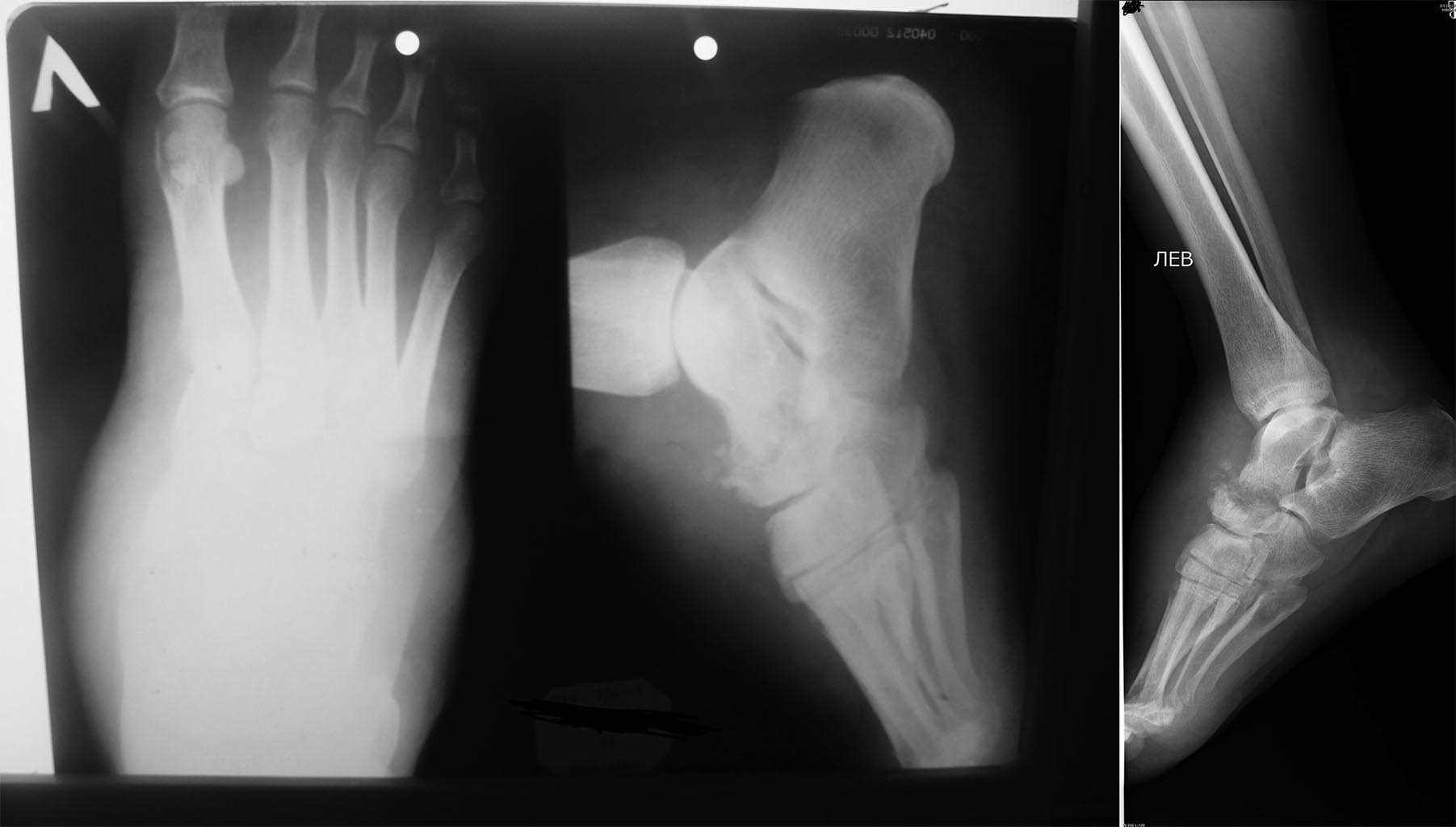 А все-таки что в биопсии? Каким способом она выполнялась? Нет онкологии, но что-то же есть? Сколько лет пациенту? Страдает ли сахарным диабетом? Есть ли симптомы периферической нейропатии? Ведь при такой деструкции не очень-то походишь, если только не нарушена чувствительность. Что за объемное образование: плотное, болезненное, подвижное? Может быть стоит прислать фото стопы и КТ бедренной кости? И томограммы стопы разбить на несколько частей, уж больно маленькие.