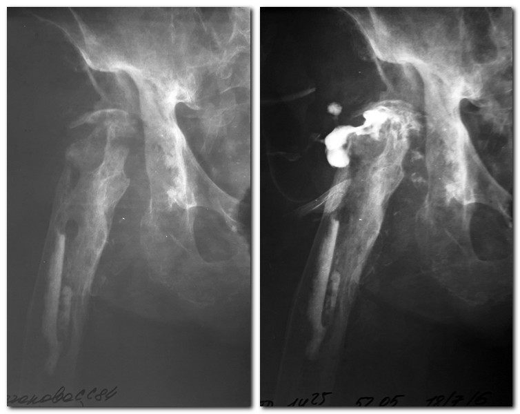 Уважаемые коллеги! Больная,84 года,удаление протеза тазобедренного сустава в 2014 году,парапротезная инфекция.2 года свищей не было. Пациентка активна, признаков деменции нет. До удаления протеза преподавала в ВУЗе. Ходила и ходит(пришла сама) с опорой при помощи ходунков с коррекцией укорочения ортопедической обувью. В канале остатки костного цемента. Удалить его тогда не удалось. Со слов больной на прошлой неделе вскрылся свищ, большое количество гнойного отделяемого выделилось. В настоящее время такая картина( Rn-грамма,фистулография).Свищ со скудным серозно-геморрагическим отделяемым. Посев сегодня взяли, в работе. Повышены маркеры воспаления: СОЭ, Лей без сдвига.СРБ, фибриноген в работе. Задумываюсь о ревизии, удалении цемента из канала, пока останавливает отсутствие заключения терапевта. Как цемент достать из канала? Инструмент Synthes ревизионный не доступен. Такой объем операции будет достаточным? Можно ли вообще обойтись без операции? Антибиотикотерапия нужна или достаточно санации? Спасибо.