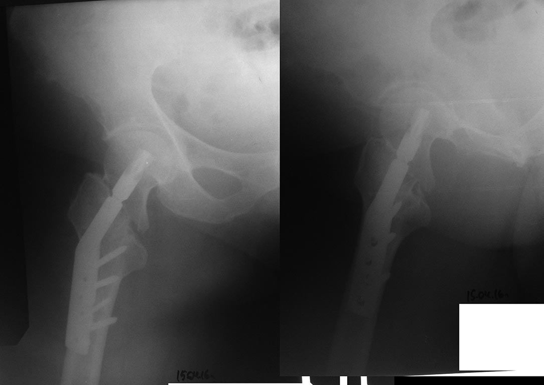 из Добрый вечер уважаемые коллеги. На консультацию обратилась пациентка 62 лет с жалобами в области правого тазобедренного сустава, хруст и ограничения движения в суставе. 21 числа больной выполнен рентген контроль, больная отправлена на консультацию к оперирующему хирургу, которым рекомендовано продолжить возрастающую нагрузку и разработку движения в суставе. Больная обратилась вновь ко мне на консультацию. Из анамнеза : около 12 лет нет месячных, около 30 лет проживает в условиях крайнего севера, 3 года принимает бивалос по интересной схеме - по 1 пакетику в течение месяца 1 раз в год, Бонвива по 1 таблетке 1 раз в месяц в течение 2 лет. Страдает двухсторонним Гонартрозом 3 степени. Передвигалась при помощи трости испытывала ограничение движений больше в правом коленном суставе, хромоту. Прошу рассмотреть несколько вариантов лечения пациентки: 1. Согласиться с рекомендациями оперирующего хирурга (разработка движения и возрастающая нагрузка), 2. Дождаться полной консолидации и удаления винта DHSA, 3. Убрать все в ближайшее время и костная пластика дефекта, 4. Убрать все в ближайшее время + костная АО-пластика + PFNA с аугментацией.