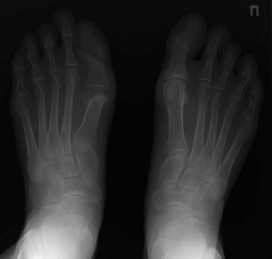 Но в каком положении находится этот фрагмент и насколько он велик, и есть ли еще остатки головки, без рентгенограммы в боковой проекции или КТ я не знаю. Предположим, что будет выполнен артродез. Если для его выполнения резецировать остатки головки, то при таком большом расстоянии между М1 и основной фалангой, как сейчас, даже установка между артродезируемыми поверхностями трансплантата толщиной 1 см приведет к еще большему укорочению первого луча. Избавит ли такой артродез пациентку от болей? Очень сомневаюсь. Потому что не понимаю, чем анкилоз ПФС1 будет лучше представленного на снимках состояния. К сожалению, без дополнительной информации дальнейшее обсуждение данного случая потеряло смысл.