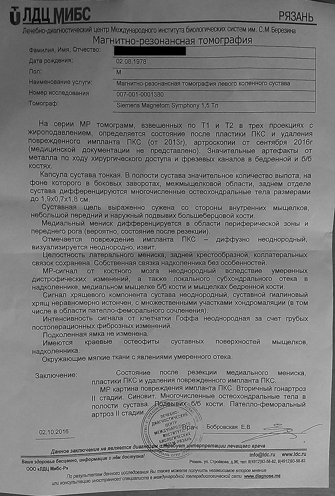 Пациент 38 лет с последствиями травм и операций коленного сустава, служил в спецподразделении. В 2008 г. - аутопластика передней крестообразной связки BTB. В 2014 г. лечился консервативно по поводу посттравматического гемартроза пункциями, МРТ не выполнялось. В сентябре 2016 поступил с клиникой блокады после того, как подвернул левую голень. Деблокирование под местной анестезией и под наркозом (sic!)без эффекта, голень оставалась в положении сгибания 45 град. На ренгенограммах в верхнем завороте определялась +ткань (остеохондральное тело?). МРТ не выполнялось. 16 сентября произведена артроскопическая ревизия левого коленного сустава, обнаружено и удалено свободное тело из верхнего заворота 4*2*1,2 см, медиальный мениск, прежде резецированный, обработан аблятором. Латеральный мениск дискоидной формы, не повреждён. ПКС разволокнена, истончена, тест Лахмана слабо положительный. Объём движений во время операции полный, после лонгету не накладывали.На следующий день обнаружена прежняя картина блокады, сам пациент отмечал болезненное напряжение задней группы мышц левого бедра.Далее проводилось лечение (НПВС, физиотерапия, массаж) с положительным эффектом - сгибание 150 град, разгибание 30 град. В пределах этой амплитуды движения полностью безболезненные, никогда не было уменьшения амплитуды, только постепенный прирост, пальпация коленного сустава безболезненная. Выполнялось МРТ головного мозга ( там "чисто"), невролог не исключает миотонию неясной этиологии.Наконец, всё же выполненное МРТ левого коленного сустава (02.10.2016) выявило наличие остеохондральных тел.