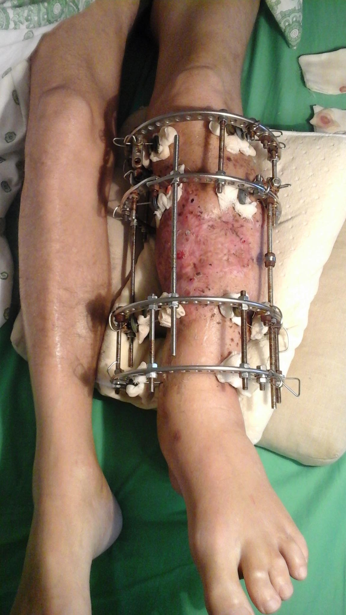 Коллеги! Прошу совета - как рациональное поступить. Пациент 65 лет, открытый перелом костей голени, травма плечевого сплетения на противоположной стороне. Травма 6 месяцев назад, ДТП. Открытый перелом голени в остром периоде был фиксирован стержневыми аппаратом, ввиду необходимости выполнения МРТ стержней аппарат был демонтирован, выполняла иммобилизация гипсовая лонгетой. После МРТ занимались нейрохирурги (остеосинтез шейный позвонков с костной пластиком аутокостью), после инфицирования перелома голени выполнены ВХО раны голени и ВЧО аппаратом Илизарова. Некроз мягких тканей голени 5%площади, неоднократно ВХО, в том числе -резекция большеберцовой кости (области перелома) в средне-нижней трети 7,0 см -на границе здоровых тканей, пластика раны местными лоскутами, интраоперационно с целью уменьшения площади раны в аппарате Илизарова произведено уменьшение дефекта бб кости и мягких тканей путем сближения промежуточных опор.