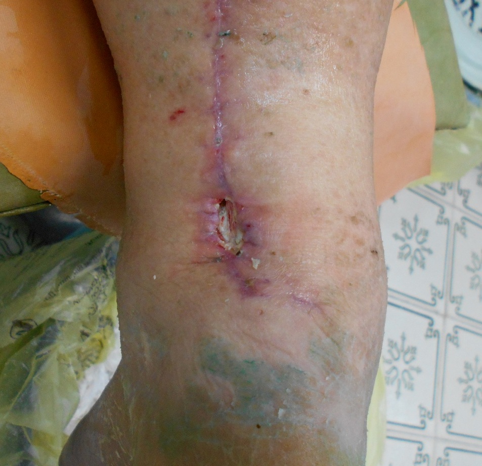 В анамнезе подкожный разрыв ахилла, больная оперирована 9.09.16, в послеоперационном периоде несостоятельность швов. В настоящее время незаживающая рана с открытым краем сухожилия и сопутствующей ХВН, отеком голени и стопы. Сейчас проводится противоотечная терапия, предполагаю пластику местными тканями.
